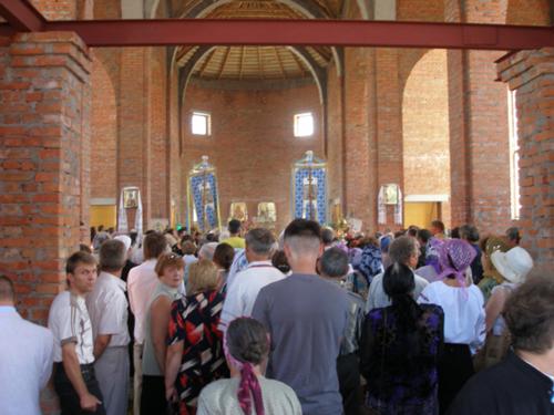 Церковь, поражающая своей красотой и размахом, внутри еще не достроена. Но это отнюдь не портило общей картины, а даже привносило некоторую душевность во все происходящее. Нештукатуренные кирпичные стены, солома на полу — всё это выглядело очень колоритно. Дорожки, ведущие к церкви, еще не были заасфальтированы, их просто посыпали песком.