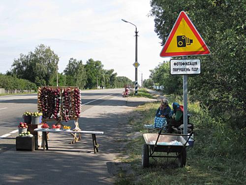 Кстати, о знаках. Обратил внимание на то, что знаки ограничения скорости с автодороги исчезли, а названия отдельных населенных пунктов, например, «Прогресс» теперь пишутся на синем фоне. С месяц назад на дорогах Украины появился новый знак – треугольник с красной каймой, на желтом фоте рисунок фотокамеры. Под ним подпись – «Фотофіксація порушень ПДР». Эти знаки облюбовали торгующие бабушки. Наверное – очень хотят «сфотографироваться». Одна из них, около села Ягодное, долго расспрашивала меня, где же камера, которая все фиксирует. Она была очень разочарована тем, что камеры нет, а значит, нет возможности покрасоваться. Торгующие под знаками - для инспекторов проблема. Их нужно постоянно «отодвигать» от знаков, чтобы они не отвлекали внимание водителей…