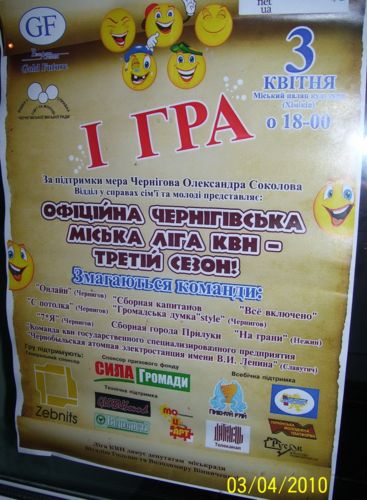 3-го апреля, в Городском Дворце Культуры прошла очередная Игра черниговской открытой лиги КВН. Любители провести свободный вечерок с пользой для души вновь полностью заполнили его уютный и удобный зал.