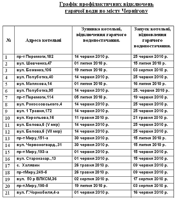 ВАТ "Облтеплокомуненерго" повідомило, що підприємство згідно графіка проводить профілактичні зупинки котелень, та у зв'язку з цим припиняє подачу гарячої води для споживачів міста Чернігова.