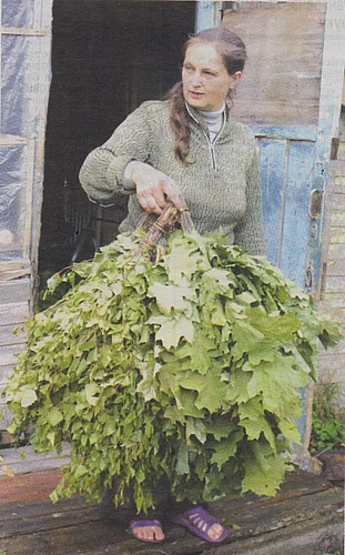 — На лисичках та чорницях можна заробити до 200 гривень на день, але в середньому виходить — 50, — розповідає Наталія. — Їздимо поїздом у Радвине. Їдемо туди о п'ятій ранку, повертаємося об одинадцятій дня. Беремо з собою велосипеди. Із залізничної станції їдемо в ліс та поля, що почали заростати лісом. На тих полях чоловік ріже гілки з молодих беріз та дубів, я в лісі поряд збираю чорниці. Як приїдемо додому, я в'яжу віники. Дуб сохне за три дні, береза довше. Спочатку сушимо під навісом, а тоді, щоб не вигорали, заносимо на хату. Там вони й зберігаються. Зараз запасаємося на зиму. Тоді віники йдуть дорожче — до 10 гривень. Насушимо 500 штук — і продаєм усю зиму. Закуповують віники професійні банщики з Чернігова, Щорса, Корюківки. Взимку ця сім'я їздить на вирубки збирати березові гілки для віників на підмітання.