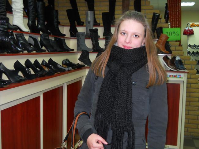 Наталья, студентка: я ищу зимнюю обувь. Хотела бы что-то комфортное черного или коричневого цвета, кожу или хороший замш. Рассчитываю на 500 – 1200 гривен. Была уже в Мегацентре. Еще посмотрю, потом решу, что купить и где.