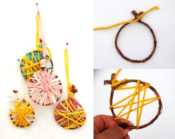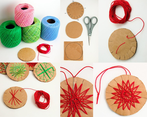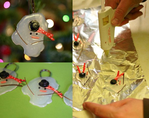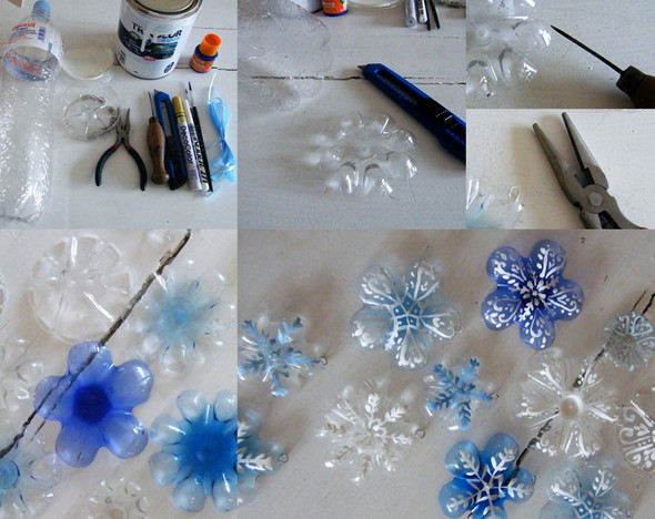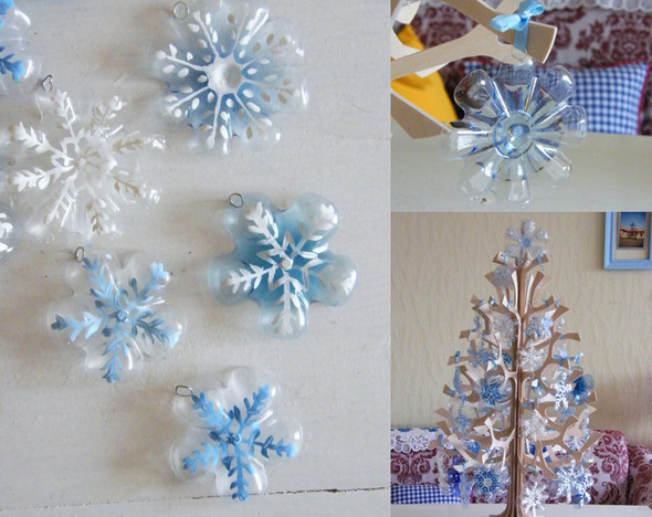 Снежинки из пластиковых бутылок. Отрезать низ бутылки, шилом сделать дырочку, нарисовать снежинку. Наверно в них и колечко не нужно, если вместо ленточки взять тонкую нитку. В данный момент это ппожалуй моя любимая идея. Источник