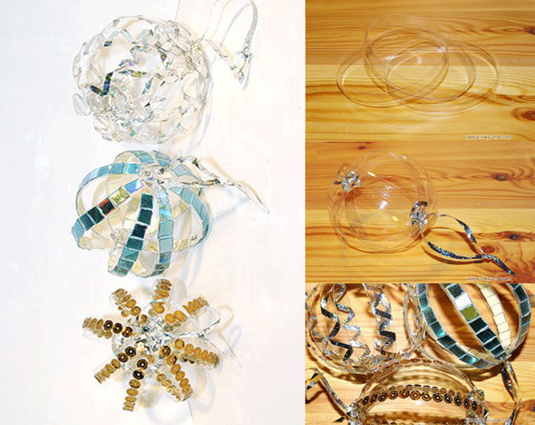 Шары из пластиковых бутылок. Бутылку порезать на тонкие кольца, скрепить и украсить. Источник