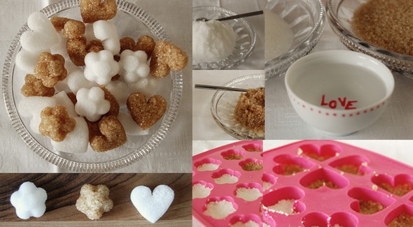 Добавить немного воды в сахар, перемешать и разложить по формочкам. После застывания уложить в сахарницу и любоваться. Источник