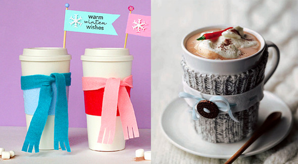 Стаканчики в шарфиках и свитерах. Если шарфики декоративны, то манжеты от свитера сохранят тепло кружки и не дадут обжечься