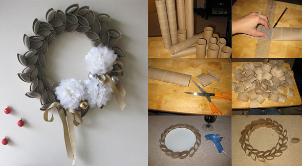 Звездочка и венок из пустых рулонов туалетной бумаги и бумажных полотенец.