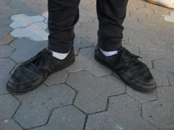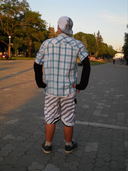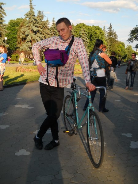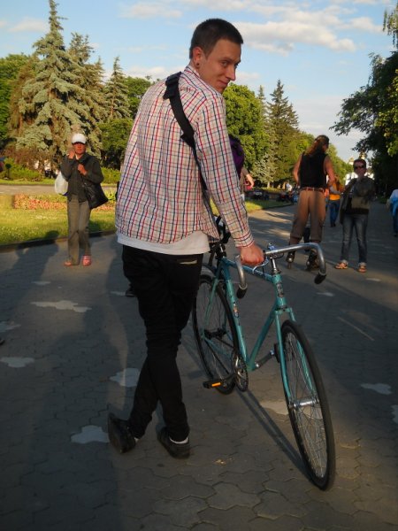Свой стиль определяет сам. Сегодня стиль Андрея – «винтаж», специально для катания на велосипеде. Многие покупки из секонда и стоков. Любимая вещь в гардробе – туфли «Yes», надетые сейчас. Если надо, наденет вещь любого стиля. По мнению Андрея, стильно выглядят парни из «Квест Пистолз». Насчет стильных девушек – задумался...