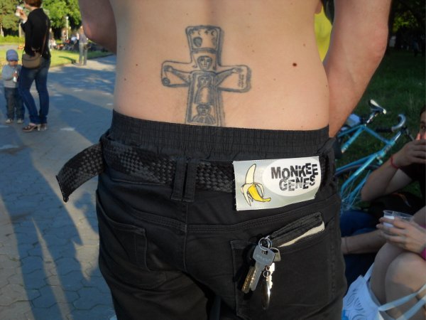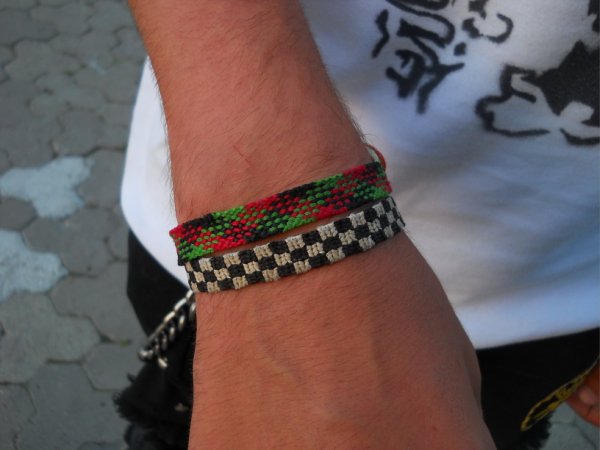 Фенечки на руке: шахматка – символ музыки «СКА», цветная – просто сочетание цветов к стилю.