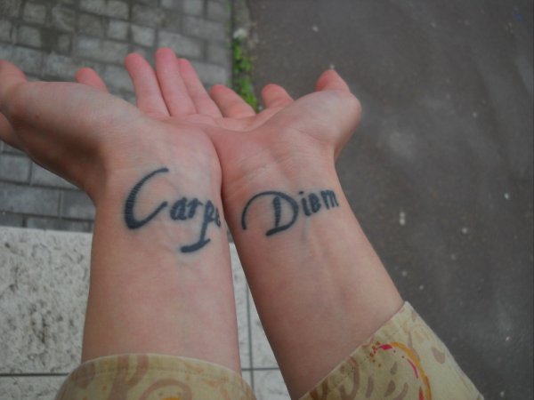 Тату на руках – крылатое латинское выражение «Карпе Дием» – «Лови момент», салон в Чернигове, 150 грн.