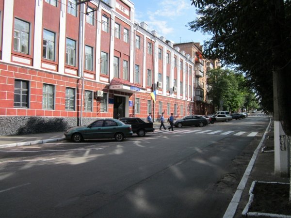 Данное здание было построено в 1947 году, и парковка возле него была ещё до устройства сквера им. Б. Хмельницкого. Для удобства перемещения по парку тогда был сделан выход на милицию и в связи с этим выходом решили, что лучше обозначить пешеходный переход, чем не иметь такого. Так там обозначили переход, положили лежачего полицейского, чем существенно снизили вероятность ДТП на этом участке. В целом в ГАИ считают совмещение стоянки и пешеходного перехода исторически сложившимся фактом.