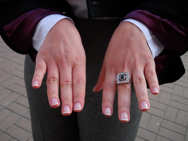 Прическа – сама. Вариантов много. Обычно – «дулька».