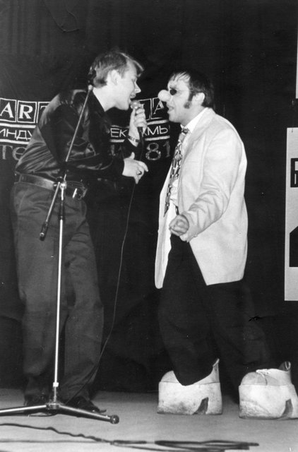 Известный черниговский путешественник-битломан Андрей Терещенко в компании главного довгоносика страны Виктора Андриенко. Чернигов, сцена Летнего театра, Чернигов, 1998 г.