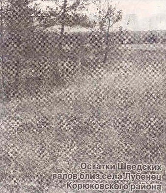 Кроме того, возле села Лубенец Корюковского района есть Шведские валы. Недалеко от них — урочище Городок (с. Ховдиевка), где каролинцы выстроили оборонительный лагерь. Был шведский городок и возле Гнездища Городнянского района. Наверное, это были места, где стояли некоторое время сторожевые отряды каролинцев после прохождения основных войск. В селе Жадово Семеновского района есть сторона Шведовка. По местным преданиям, здесь жили пленные шведы. Не случайно у многих жадовских жителей фамилии Швед. Так местные казаки переиминовывали трудные в произношении имена пришельца из Скандинавии на понятные, простые. В Гуте-Студевецкой Щорского района так-же напоминает о тех временах. своим названием сторона Шведовщина. По воспоминаниям старожилов села Шведчина, их населенный пункт возник на месте шведского лазарета. В Шведчине и поныне есть Шведский колодец («на Пасху туда за водой ходили, это на выходе из села»).
