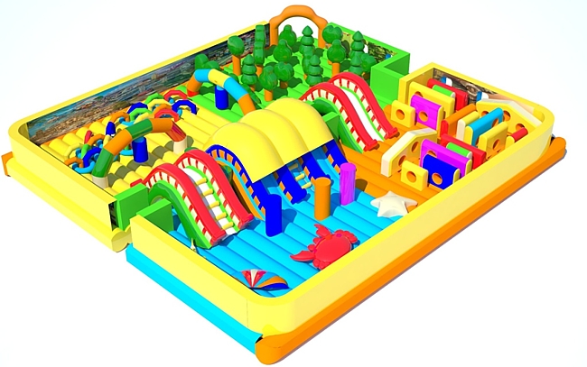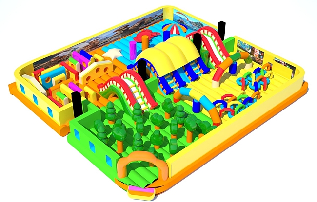 Надувное сооружение длиной 18 метров и 17 метров в ширину разделено на четыре тематические секции с горками, лабиринтами и множеством других элементов.