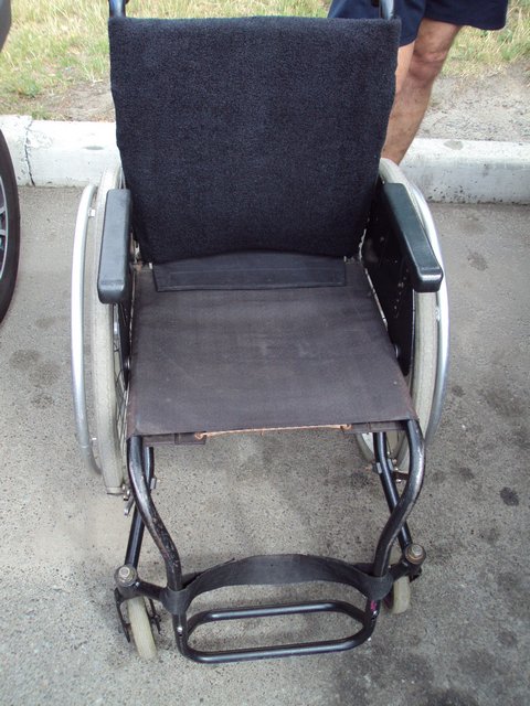 Моей коляске украинского производства уже 6 лет. Она очень неудобная, везде давит и трет. Коляска совершенно не приспособлена для использования. Саша ее доделывал, привинтил подлокотники, поставил другие колеса и тормоза. По сути, чтобы приспособить мою коляску к использованию пришлось много над ней поработать. Буквально вчера мы обтянули коляску новой тканью, чтобы она имела хотя бы какой-то более-менее пристойный вид.