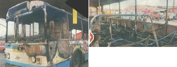 — Горят с примерной периодичностью один троллейбус в год. Все загоревшиеся машины — 1992 года выпуска. завод в городе Энгельс Саратовской области. Это одна серия, все вместе брались. Конструктивная особенность такая, что высоковольтные провода в платмассовом коробе, поэтому при замыкании происходит быстрое возгорание. Из горевших три машины уже списаны как сгоревшие, три восстановлены после пожара. И вот еще один, восстанавливаться он не будет.