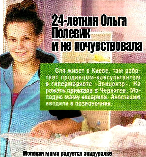 Оля живет в Киеве, там работает продавцом-консультантом в гипермаркете "Эпицентр". Но рожать приехала в Чернигов. Молодую маму кесарили. Анестезию вводили в позвоночник.