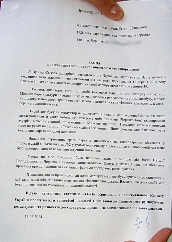 11 июня около 15 часов дня Евгения Дмитриевна, пенсионерка из Чернигова, 87 лет отроду, человек заслуживающий уважения и восхищения – активистка и большой оптимист, на остановке «Центральный парк культуры и отдыха» зашла в автобус №39 (перевозчик – КП «Черниговское троллейбусное управление», начальник – Олег Коржов). Автобус двигался в направлении центра города. Как рассказывает сама Евгения Дмитриевна, не успела она зайти в автобус, как тот резко рванул с места, поскольку водитель, видимо, куда-то спешил. Естественно, пожилая женщина не удержалась и упала плашмя на пол. Кондуктор даже не помогла ей встать, а водитель злобно сказал: «Нечего ездить, дома надо сидеть, если не можете стоять на ногах. Вставайте!».