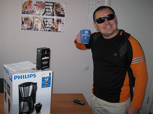 Сегодня в нашей редакции побывал Андрей Кудабеков - он же блоггер АК-74, который по итогам месяца стал самым популярным блоггером августа, блогадаря голосам и комментариям наших читателей. Ему была вручена кофеварка, пачка кофе и фирменная чашка Gorod.cn.ua, из которой можно пить кофей, чай и лимонад с молоком долгими осенними вечерами)))