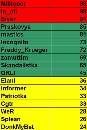 Как видите наметились первые лидеры: Millioner, In_oll и mastics – так держать! Остальные – не вешать нос, вы еще сто раз можете догнать и перегнать их:-)