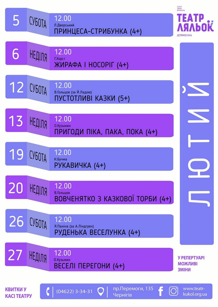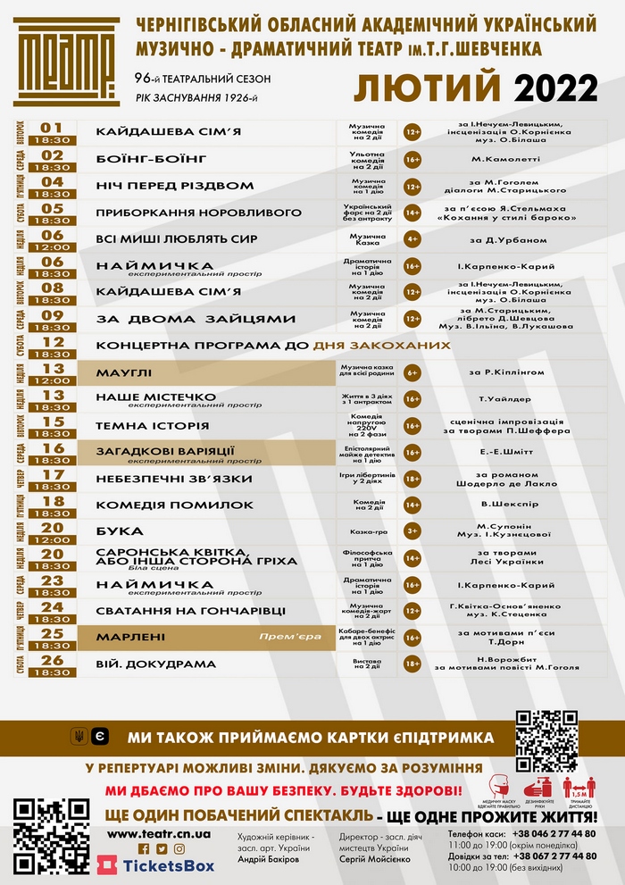 | «Сильні слабкі жінки» | Облдрамтеатр, проспект Миру, 23, тел. (0462) 77-44-80 (касса, 11:00-19:00). Довідка: (0462) 675 280 |