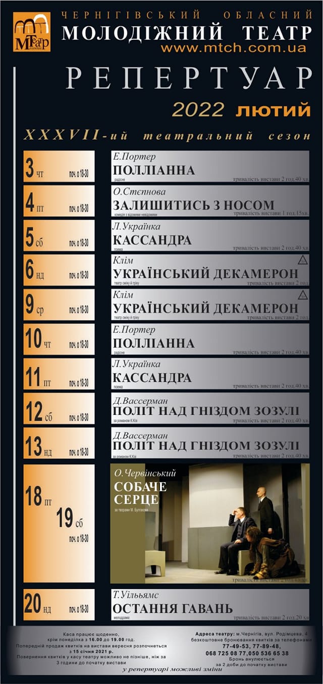 | «Граємо у дурня» | Облдрамтеатр, проспект Миру, 23, тел. (0462) 77-44-80 (касса, 11:00-19:00). Довідка: (0462) 675 280 |
