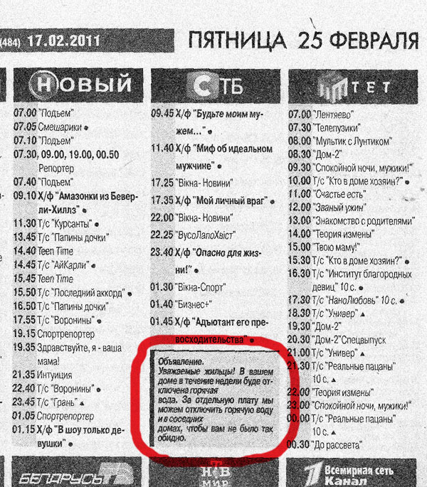звонок в редакцию. бабушка, визжащим голосом: "зачем вы в своей газетенке не правдивую информацию распространяете!!! зачем вы напечатали что 25 февраля будет отключена горячая вода!!! я всех знакомых обзвонила!!! в ТЭЦ всех на уши подняла! не отключают воду!" чел который с ней разговаривает просит назвать номер газеты и номер страницы. она называет, он находит и сползает под стол )))