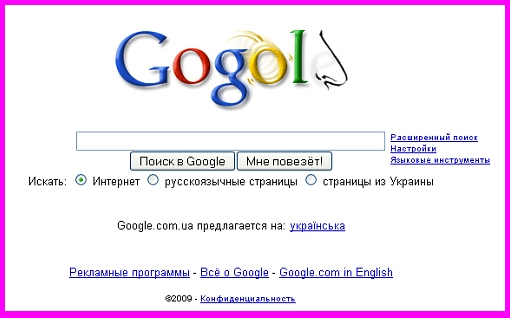 Кстати такой выбор изменения лого Гугла на 1 день - 1-е апреля неслучаен. Компания решила присоединиться к празднованию 200-летнего юбилея писателя Николая Гоголя. И теперь по нажатию на этот новый модернизированый логотип вас выбивает на страничку с выдачей результатов по запросу "Николай Гоголь"