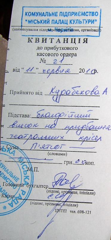 Потом, 11 июня, начитавшись пасквилей Зинина в газете " "Народный" контроль", и узнав, какая я скотина, что бухаю после успешного завешения концерта за деньги предназначенные ветеранам, пропивая, в придачу, кресла в ДК "Химиков", я на волне собственной совести приобретаю кресло в городской дворец культуры. Правда подленький Зинин не знал, что как поёт Ронезнбаум, "Моня не гордый, Моня пьёт на свои!...", впрочем, как и остальные уважаемые черниговцы принимавшие участие е в проекте "Танец мечты - 2" Видимо он по себе судит...