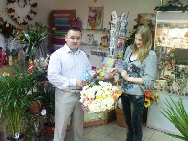 Принял душ, оделся всяко-нарядно, зашёл в салон цветов и декора "Времена года" и получил полную корзину цветов.