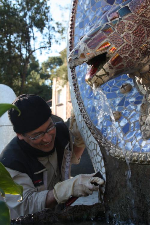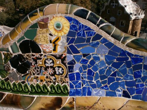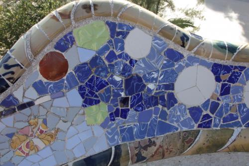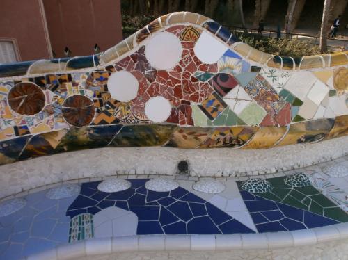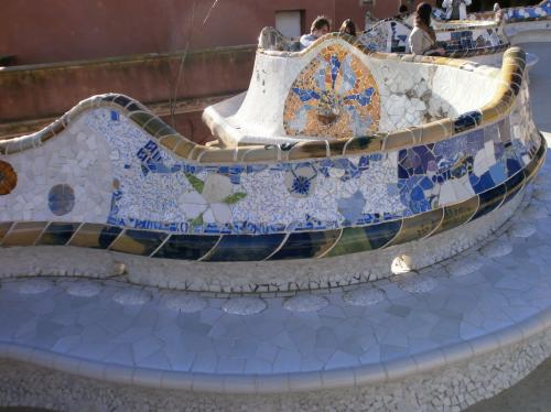 Площадь в парке Гуэля окружена скамьями и бортиками с легендарной мозаикой, когторая, по описаниям тогдашнего журналиста создавалась так: "Я увидел 30 мужчин, которые изо всех сил били посуду, а потом гауди её вновь склеивал".