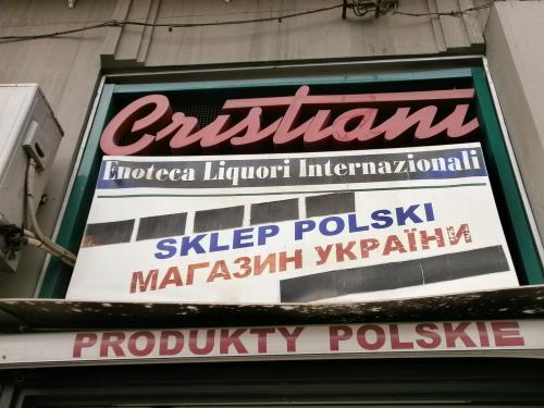 Прямо на ней - польский магазин с афроамериканкой-продавцом, русскими наименованиями товаров и нежинскими огурцами. Очевидно желание администрации удовлетворить всех и разом.
