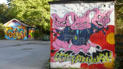Ряд домов окрашен невероятными, почти галлюциногенными граффити. Кажется, что путешествуешь между «Алисой в стране чудес» и «Желтой подводной лодкой».
