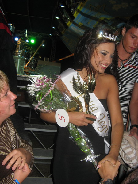 Наконец, Супрун созрела и началась мучительно-долгая церемония объявления результатов – все понятно, сначала девушкам цветы, потом какие-то специальные подарки… все бы хорошо, но ветер с песком. Пошли номинации. Наташа Воробей в числе тех, кому ничего не досталось – становится тревожно. И вот, наконец: «Первая леди…. Номер 5, город Чернигов!» Что творилось в этот момент справа от сцены, где были наши – такого не увидишь и на футбольных матчах, просто сплошной «We are the champions!» Слезы, сопли и шок для остальных.