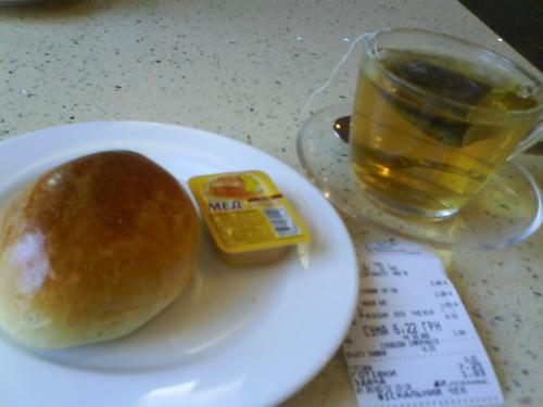 Линия довольно большая и судя по всему не дорогая, просто мы «перекусывать» не хотели, поэтому не оценил, но видел такие интерсные цифры, как 2.50 (на салаты). Себе взял чай, мед, булочку с маком, вышло 6 грн.