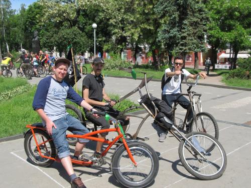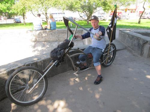 Познакомился с собратьями по «кастому». К сожалению, легендарный Вова Копыстко (начинатель кастом байкинга в Чернигове) все свои шедевры попродавал, но зато развлекал народ своим катанием на одноколесном велике. Тем не менее у него появились последователи. Все видели это железное трехметровое чудо с саблями вместо руля? Вот это Димон, он кузнец, у него есть брат Богдан, тот тоже себе собирает байк, а еще у Димы есть батя, который приехал на тандеме, сваренном из двух «украин». Такая вот «кастом» семейка.