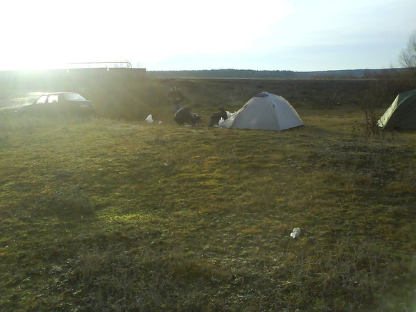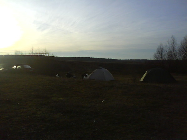 Не помню, как речь зашла о палатке, но решили ее ставить. Это был примерно пик моего «некондишн», я че-то копошился там, че-то сооружал, а Ломако издевался. Один раз уже начал правильно, потом меня сбили с толку… долго мы над этой палаткой страдали – а меня еще такой облом взял… Потом палатку поставил Воробьев, он кстати привез восставшего из зАда Макса. Саша и Рома решили ехать – мы героически решили остаться. Дернули Бехеровки на коня, Ломако подарил мне бутылку и пива и Опель пошуршал вдаль по песчаной дороге.