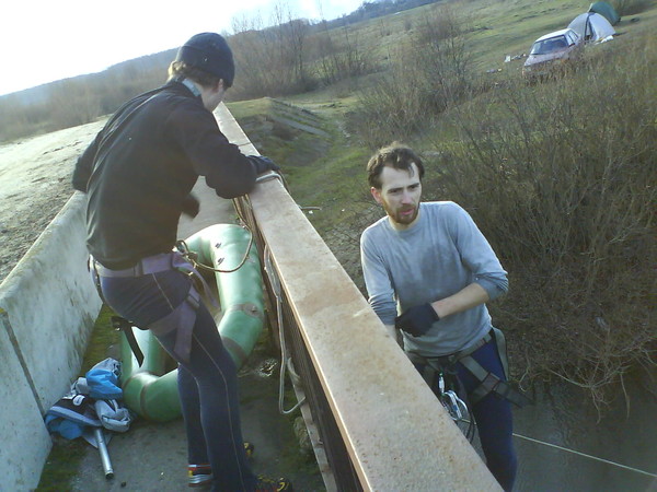 Вобщем, если поспали час – это хорошо. Надоело в палатке, полезли наружу. Солнце было уже довольно высоко. Рядом на мосту выполняли задания команды. По сценарию, мост, типа разрушенный. Один плывет на своем плавсредстве с веревкой, закрепляется на опоре, залазит, а потом остальные с другой опоры переправляются и перетягивают вещи. Было много приколов.