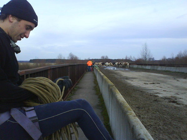 Показались Китоны – самая харизматичная команда гонок. Мы долго думали с Лидой, на кого-же из знаменитостей похож Сабуренков? На кого-то ж похож! А Чегевара на переправе потерял очки. Мы поднялись к ним на мост, потриндеть под руку. Вдруг, вдалеке показалось нечто невообразимое для моего цивильного урбанистического сознания – огромное стадо коров! Это было фантастически и потрясающе! Даже сташно… такие огромные рогатые существа.
