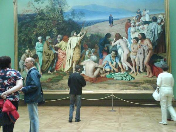 Поражает всякое воображение. Здесь я уже решил по-шпионски фотографировать телефоном. Эту картину автор писал 20 лет своей жизни, поражает не только масштаб (полотно действительно нереально огромное), но и проработка деталей, и композиция, и эмоции. Чувак даже царя не пустил в свое время к себе в мастерскую, когда над ней работал. Вокруг шедевра 2 зала с этюдами, набросками и пейзажами Иванова. Пейзажи крутые, особенно ветка понравилась, а вот с обнаженными мальчиками-натурщиками перебор, возникают всяческие подозрения.