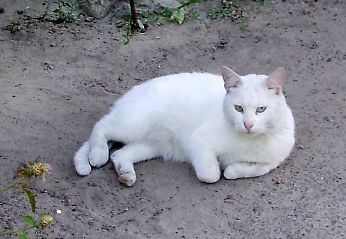 Под заборами лежат коты, этот примечателен тем, что у него два глаза разного цвета - один желтый, второй голубой. Не знаю хорошо ли видно на фото.