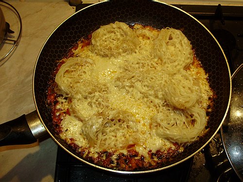 Испробовала новую плиту - паста-гнезда с соусом из курицы, томатом, луком и сверху сыр