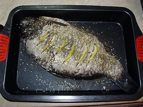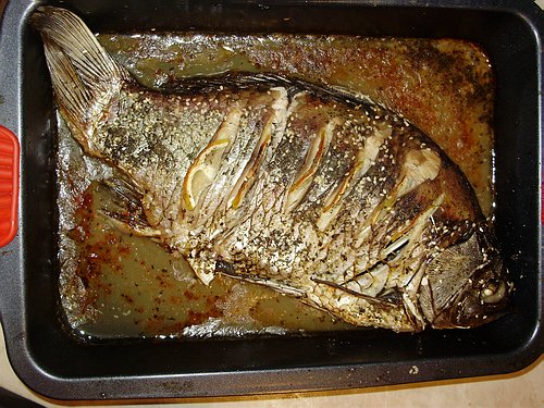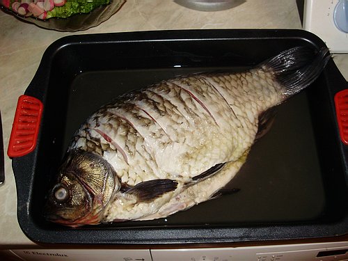 Этого карася купила уже под закрытие в рыбном павильоне. Никогда не готовила именно карасей - сделала по рецепту продавщицы и получилось ничего себе. Я их не особенно люблю, но кроме карасей ничего из живой рыбы уже не осталось((
