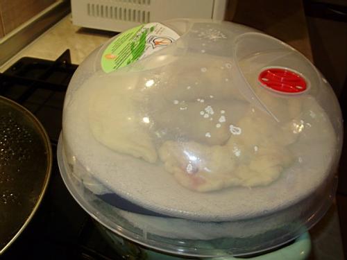 Мантовницы у меня нет и глубокой миски, чтобы накрыть кастрюлю – тоже, поэтому использовала по старинному дедовскому методу – марлю. А накрывала варенички – специальной крышкой, для микроволновки. Впопыхах даже забыла снять с нее этикетку – использовала первый раз))