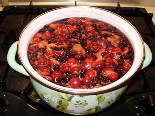 Из оставшихся вишен, с добавлением черной смородины было решено сварить витаминный компот – тоже первый раз в жизни. Остальные, разложив по пакетам - заморозила. Раньше я считала что компот – напиток для малышей, а чай и кофе – взрослых. Оказывается, охлажденный компот в жару – не хуже кваса, или мохито)))