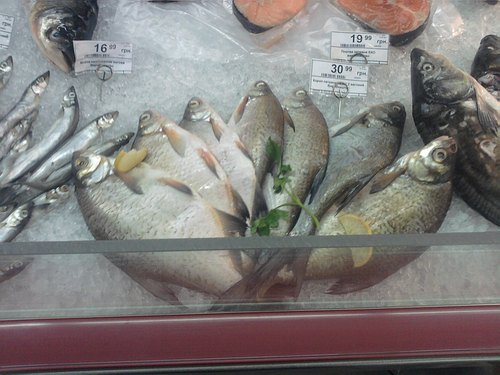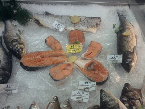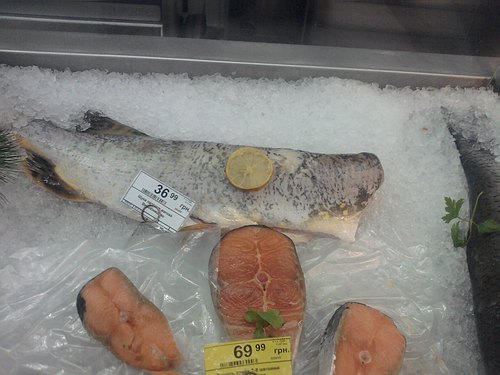В этот раз вдохновила на съемку рыбная витрина. В центре – очень уставшие стейки лосося, который кстати, с конца декабря подешевел и теперь во всех магазинах города стоит не дороже, чем 69 за кг. А на другой рыбке рядом, лежали сморщенные, увядшие, с коричневыми крапинками кусочки лимончика. Кстати, то что он такой не так уж плохо – по нему можно примерно установить сколько же суток рыбке)) Хи-хи)) В общем, с рыбой в тот день не сложилось. А на кассе, как я писала выше подвел терминал. Чуть было не осталась без еды – минут 10 две продавщицы и охранник колдовали над чудо-устройством, пока наконец долгожданная связь не появилась на секундочку.