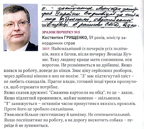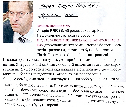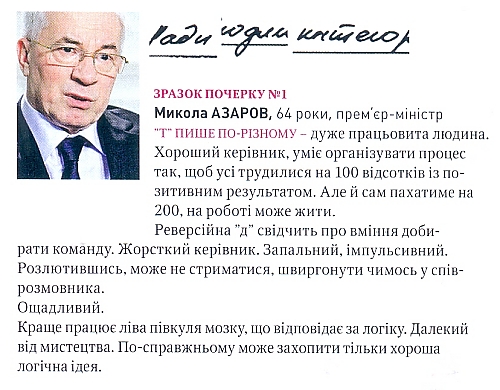 Давече читала последний номер «Країни» и наткнулась на совершенно очаровательную, впрочем, не уникальную (видела подобное в российских изданиях) тему номера, где графолог Григорий Семчук исследовал почерка украинских власть имущих. Образцы почерков редакция добывала всем миром, это и отзывы из музеев, и примеры заполненных фигурантами налоговых деклараций, и росписи на государственно важных документах. Уверяют, что Семчук не знал, чьи примеры ему показывают. Сам он преподает физиогномику и графологию на частных курсах. Помогает определять крупным компаниям каких людей брать на ту или иную ключевую должность. Утверждает, что по почерку на 90% можно провести анализ характера и поведения человека.