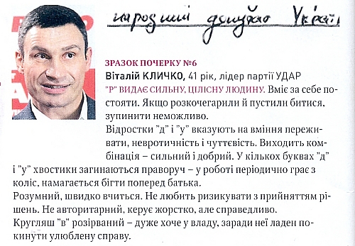 Всего в журнале представлено 20 персон, есть все политические лидеры, кроме Януковича. То ли образец его почерка достать было трудно, то ли редакция не рискнула. Хотя они в каждом номере критикуют его по всем направлениям в довольно резкой форме.