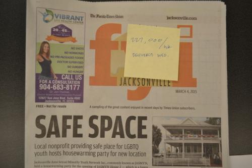 А также о том, что они имеют договора на то, чтобы доставлять газеты по Джексонвиллю с такими газетами как Нью-Йорк Таймс, Волл Стрит Джорнал и прочие – всего 8-10 газет. Цифру о том, сколько всего рекламодателей у ФТЮ он не смог назвать, сказал только приблизительно сколько фирм дают рекламу в FYI каждый день/недель и что это зависит от праздников, времен года и прочее. И также он не знает, сколько подписок имеет пресловутый Нью-Йорк Таймс по сравнению с их изданиями. Это был праздный интерес от меня, название НЙТ действует на меня магически, когда я его слышу и было интересно знать сколько его читает в Джексонвилле.